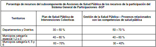 En consecuencia, de los recursos del subcomponente de Acciones de Salud Pública y de los recursos de la participación en salud del Sistema General de Participaciones – SGP, las entidades territoriales de todos los órdenes, destinarán para uno y otro concepto, según su naturaleza y categoría, los siguientes porcentajes: