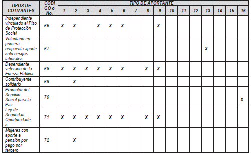 Aportes al Sistema General de Pensiones: <Ver Notas de Vigencia por suspensión. Consultar texto aplicable en Legislación Anterior> <Acápite modificado por el artículo 1 de la Resolución 467 de 2025. El nuevo texto es el siguiente:> Corresponde a las cotizaciones que realizan a través de la Planilla Integrada de Liquidación de Aportes - PILA, las personas que se encuentran vinculadas mediante contrato de trabajo o como servidores públicos; los contratistas; los independientes con ingresos netos iguales o superiores a un salario mínimo mensual legal vigente; los pensionados con pensión de jubilación para compartir y con pensión convencional para compartir mientras reúnen los requisitos para la pensión de vejez; a las cuales les aplique el régimen de transición de que trata el artículo 75 de la Ley 2381 de 2024.