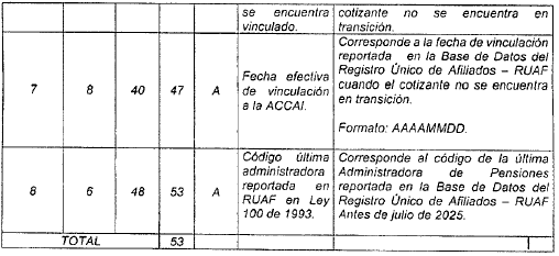| 8 | 1 | 49 | 49 | N | Dígito de verificación de la CCF. | Para activos es el tomado en el campo 5 del registro tipo 7 del Anexo Técnico 2. Para pagadores de pensiones es el tomado en el campo 5 del registro tipo 6 del Anexo Técnico 3. |