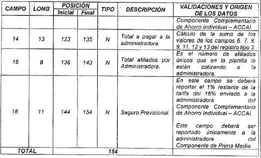 | 15 | 8 | 172 | 179 | N | Total cotizantes pensiones. | Sumatoria de los campos 18 de los registros tipo 3 de esta planilla. |