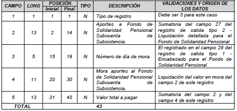 | 6 | 15 | 37 | 51 | N | Total a pagar al Fondo de Solidaridad Pensional. | Para activos es el tomado en el campo 3 del registro tipo 12 del Anexo Técnico 2. Para pagadores de pensiones es el tomado en el campo 3 del registro tipo 7 del Anexo Técnico 3. |