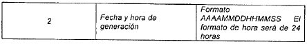 | 1 | 2 | 1 | 2 | N | Tipo de registro. | Obligatorio. Debe ser 11. Lo genera el sistema del operador de información. |
