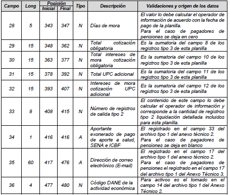 | 3 | 2 | 10 | 11 | N | Código del operador | Para activos es el tomado en el campo 28 del archivo tipo 1 del anexo técnico 2. Para pagadores de pensiones es el tomado en el campo 25 del archivo tipo 1 del anexo técnico 3. |