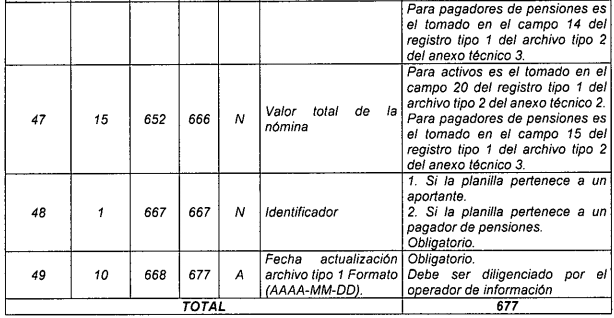 | 5 | 15 | 22 | 36 | N | Total a pagar a pensiones. | Para activos es el tomado en el campo 2 del registro tipo 12 del Anexo Técnico 2. Para pagadores de pensiones es el tomado en el campo 2 del registro tipo 7 del Anexo Técnico 3. |