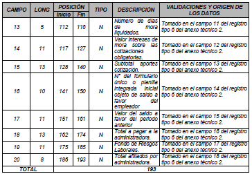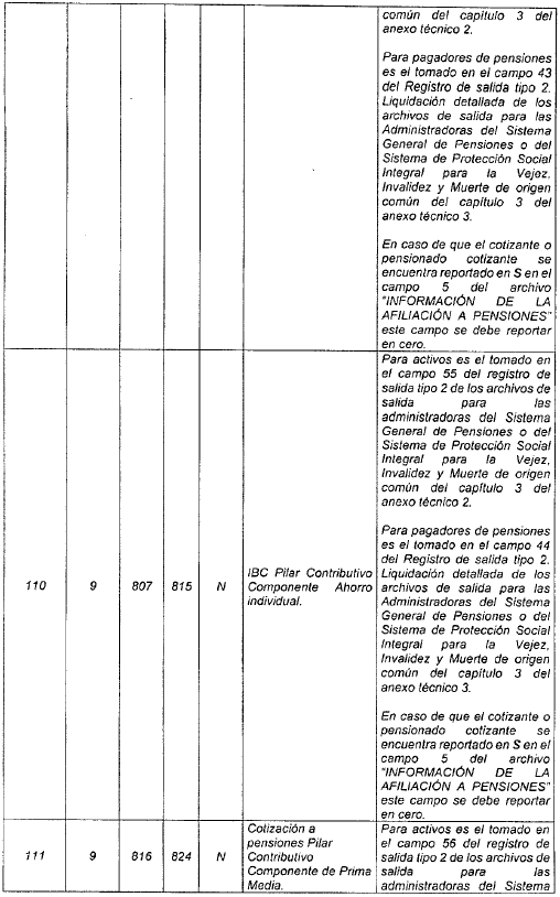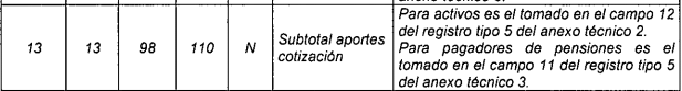 | 12 | 13 | 99 | 111 | N | Valor neto aportes cotización. | Tomado en el campo 10 del registro tipo 6 del Anexo Técnico 2. |