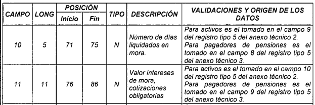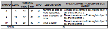 | 8 | 4 | 52 | 55 | N | Número de días de mora liquidados. | Tomado en el campo 6 del registro tipo 11 del Anexo Técnico 2. |