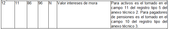 | 9 | 11 | 56 | 66 | N | Valor intereses de mora. | Tomado en el campo 7 del registro tipo 11 del Anexo Técnico 2. |