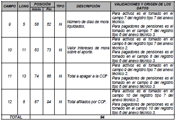 | 9 | 15 | 82 | 96 | N | Total a pagar a Cajas de Compensación. | Para activos es el tomado en el campo 6 del registro tipo 12 del Anexo Técnico 2. Para pagadores de pensiones es el tomado en el campo 5 del registro tipo 7 del Anexo Técnico 3. |