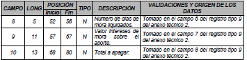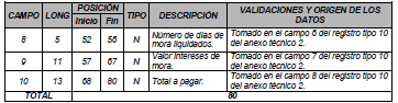 | 8 | 4 | 52 | 55 | N | Número de días de mora liquidados. | Tomado en el campo 6 del registro tipo 9 del Anexo Técnico 2. |